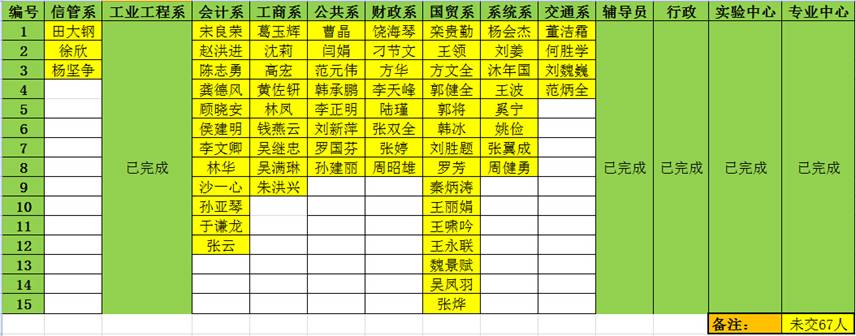 以下67位老师尚未完成固定资产自查工作。为不影响学院固定资产清查工作的整体进度,请尽快完成自查并提交《自查登记表》。