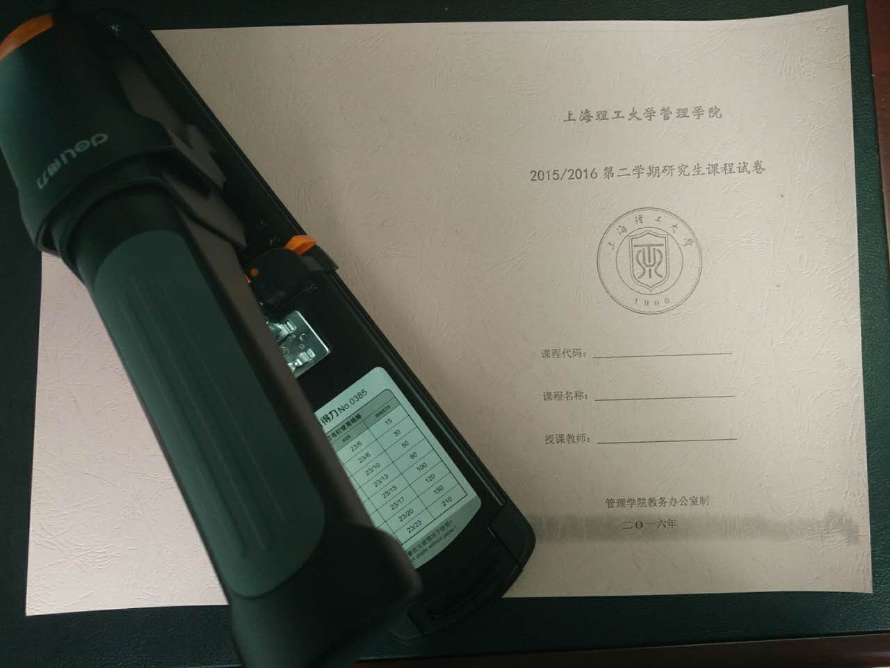 本着不断提升和完善服务质量的原则,研究生教务办公室将采用新的装订方法,请各位老师将成绩单三份,进程表两份,和去钉后的试卷交到415办公室,我们将采用图中的新封面和设备为大家装订,感谢各位老师的配合!