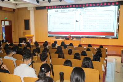 9月15日,管理学院在学院第一会议室举办以“坚守科学道德,共建优良学风”为主旨的研究生“科学道德与学风建设”宣讲教育报告会,管理学院副院长张永庆教授应邀为2020级研究生新生作专题报告。