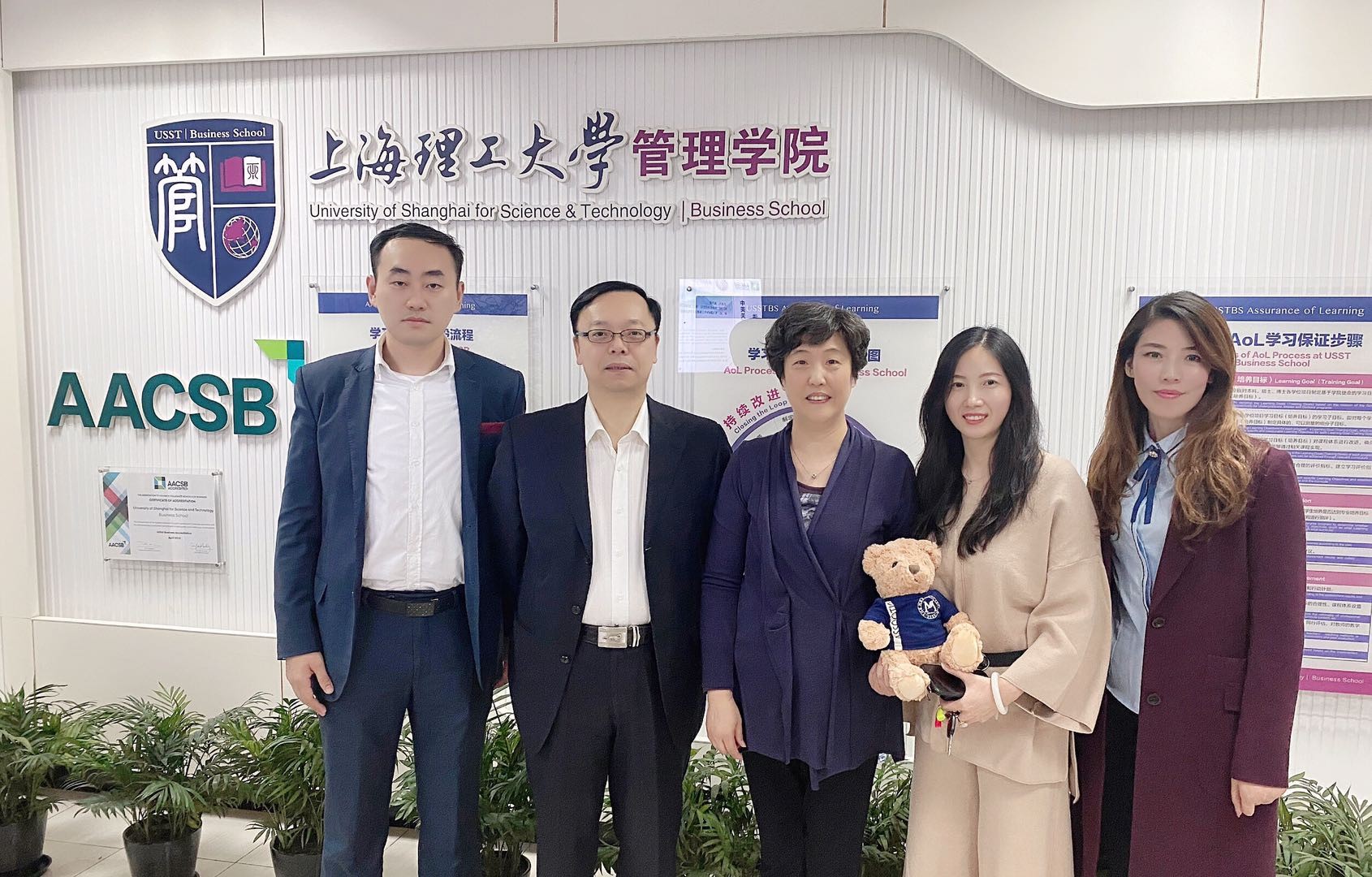 管理学院院长赵来军(左二)和党委书记汪维(中)与上海MBA联谊会理事长吕俊(右二)等一行合影