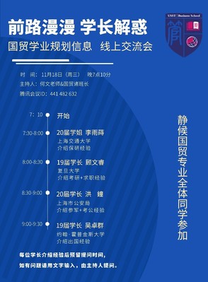 11月18日,学院国际经济与贸易系举办的“国贸学业规划交流会”通过腾讯会议软件以线上形式召开。该项交流会共邀请四位国贸系往届优秀的毕业生,分别从保研、考研求职、参军考公与出国四个方面分享经验。交流会面向国贸系全体在校学生,旨在帮助同学们找寻今后的学业和职业目标与方向,借鉴前辈们的经验较合理地制定自己的人生规划。会议由何文老师主持,国贸系主任罗芳教授出席会议并做了会议发言,国贸系教师及百余名在校学生参加了会议。