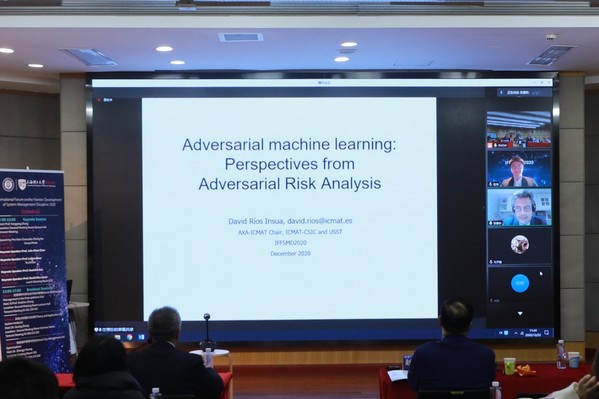 随后召开的主论坛上,陈界山教授以“Smoothing strategies for support vector regression and signalreconstruction”为题,结合数据科学中的优化问题深入浅出地介绍了光滑策略在支持向量回归与信号重构中的理论及应用。赵来军教授以“The systematic thinking on constructing theseamless emergency management of China”为题,从专业的视角出发分析突发事件管理的复杂性,介绍了当前我国应急管理体系的现状及现存的主要问题,分享了安全韧性理论和无缝隙化组织理论的进展和实践,并给出了完善我国应急管理体系的对策建议。高怀珠教授以“Systems innovation and management towards smartand healthy cities: integrated modeling and analysis of transportation, airpollution, and public health”为题,分享了如何用系统管理的思维方式与分析方法在城市交通、空气污染和公共健康领域进行建模分析的经验。最后,David Ríos Insua教授以“Adversarial Machine Learning. Perspectives fromAdversarial Risk Analysis”为题,从对抗风险分析的视角介绍了在对抗机器学习领域的科学研究进展。