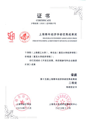 近日,上海市经济学会、上海市人民政府发展研究中心联合主办,中共上海市委党校承办的第十五届上海青年经济学者论坛暨上海青年经济学者优秀成果奖颁奖仪式召开。ICNE中心研究员卞泽阳第一署名的论文”开发区政策、供应链参与和企业融资约束”(复旦大学李志远、徐铭遥同著)获得本届上海青年经济学者优秀成果奖二等奖。