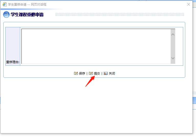 第四步,在弹出的课程重修申请页面中填写申请理由,并点击“提交”。