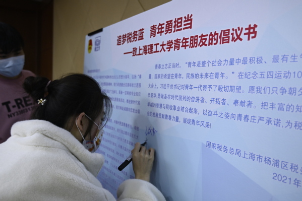 最后,工作人员表示愿税收专业的学生将智慧与税收事业结合起来,为税收事业的发展贡献自己的一份力量。在双方的共同倡议下,学生代表签署了“追梦税务蓝,青年勇担当”杨浦区税务局致上海理工大学青年朋友的倡议书。