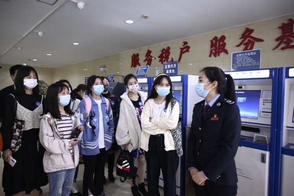 工作人员首先带领大家先后参观杨浦区税务局办税服务大厅(全国青年文明号)、12366纳税服务热线远程坐席接线办公室和杨浦税务“税立方”专家门诊咨询室,零距离感受税收日常。参观了一楼自助办税区,为同学们演示了自助办税取票流程。在亲身体验过自助办税的便利之后,同学们纷纷感叹科技时代办税服务的高效。