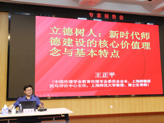 会上,王正平以“立德树人:新时代师德建设的核心价值理念与基本特点“为题,紧扣十九大和全国教育大会关于立德树人、加强师德建设的重要精神,结合新时代的教育形势,强调教师应当发扬师德大爱。他从新时代高校教师职业行为十项准则、现代教育事业的道德要求以及教师伦理的基本特点等方面引经据典,对加强和改进新时代师德师风建设提出了自身的见解,指出中华民族正迎接一个伟大的新时代,新的社会环境需要建构与时俱进又面向实践的新师德,重筑时代新师魂。