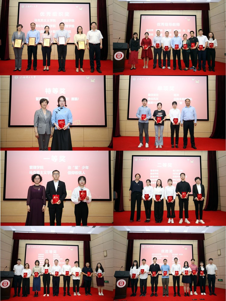校党委宣传部部长叶磊宣读获奖名单,管理学院“来!赛鹅!”上海寻访团队获得特等奖,马克思主义学院的“信仰收信人” 浙江、山东寻访队和管理学院的“追星少年”河南、重庆寻访队获得一等奖;管理学院的 “闪闪红星”云南、广西和贵州寻访队和基础学院的“申红记忆”上海寻访队等五支队伍获得二等奖;材料与化学学院的“红色足迹”安徽、江苏寻访队、基础学院的“知行追光者”安徽、山西寻访队、管理学院“乘风破浪”北京寻访队等八支队伍获得三等奖。此外,光电学院的“沪江光子”广东寻访队、材料与化学学院的“星火燎原梦之队”天津寻访队荣获优胜奖。
