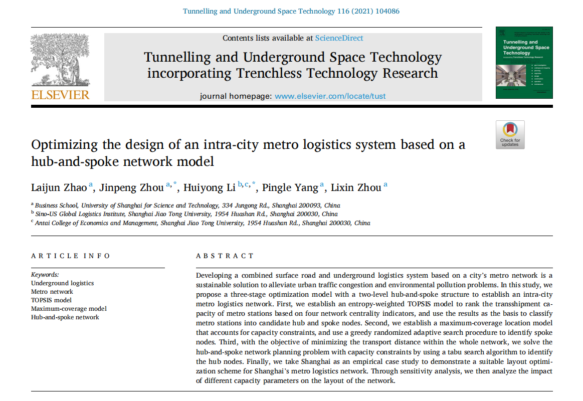 近日,由我校管理学院赵来军教授与硕士生周金鹏等共同完成的论文《Optimizing the design of an intra-city metro logistics system based on a hub-and-spokenetwork model》在国际重要期刊《Tunnelling and Underground Space Technology》上发表。