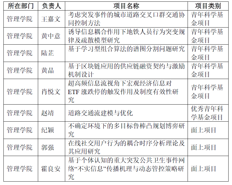 8月18日,国家自然科学基金委员会公布2021年申报国家自然科学基金项目获批立项情况。我院9位教师及管理科学与工程博士后科研流动站、系统科学博士后科研流动站3位博士后,获2021年度国家自然科学基金项目立项,其中:青年科学基金项目8项,面上基金项目3项,优秀青年科学基金项目1项。立项清单如下: