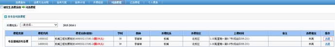 选课:首先计划里有某课程,然后当前学期可选课程里有该课程的班级(即此课程已经建立了教学班,可查看研究生信息网发布的学期专业课表),进入“可选课程”找到该课,点击“选择”,则此课将会进入您的已选课程,并会出现在课表里,选课即告成功。
