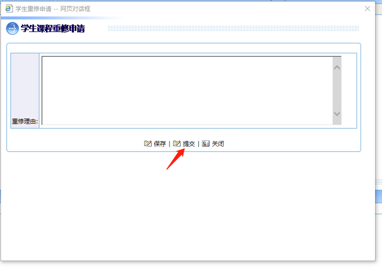 第四步,在弹出的课程重修申请页面中填写申请理由,并点击“提交”。