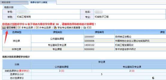 第四步,在学生制定自己的培养计划后,点击“提交审核”将自己个人的培养计划提交给导师进行审核。
