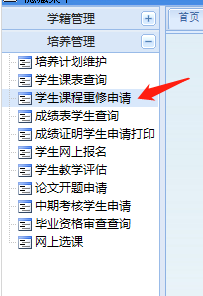 第一步,点击研究生信息系统,“培养管理”菜单下“学生课程重修申请”选项卡。