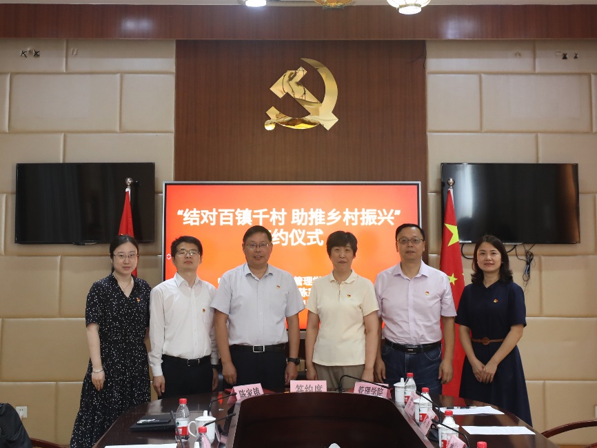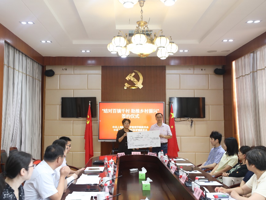 发言结束后,党委书记汪维与陈家镇党委书记张振斌签署“结对百镇千村 助推乡村振兴”结对帮扶协议书。管理学院院长赵来军向陈家镇协隆村转赠管理学院党员教工捐款帮扶陈家镇发展光伏产业基金。