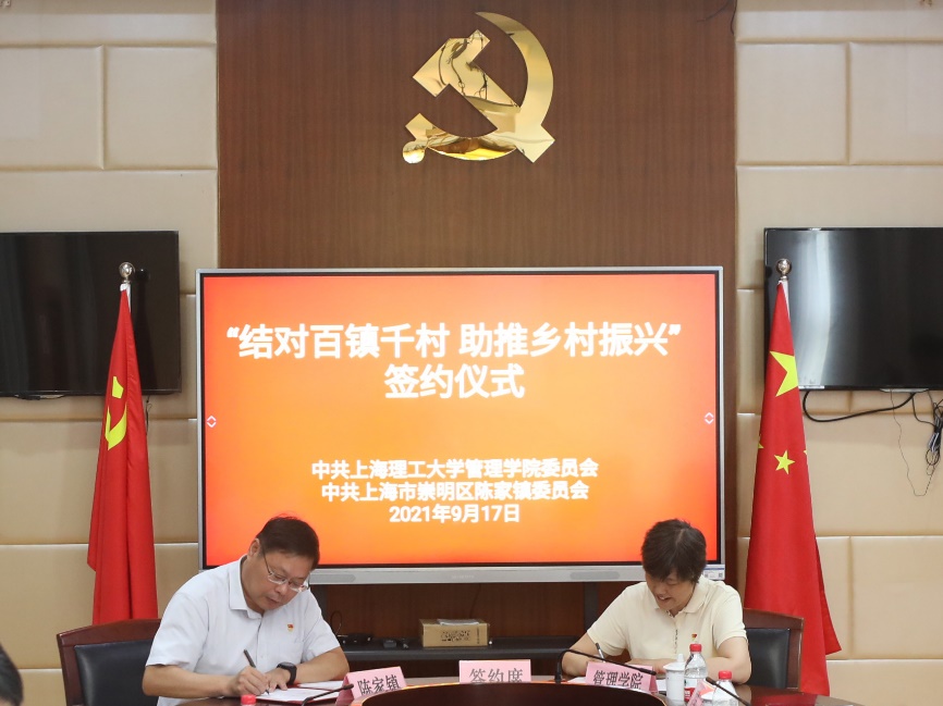 为深入贯彻乡村振兴战略,落实“结对百镇千村 助推乡村振兴”行动计划,9月17日上午,管理学院党委与崇明区陈家镇党委举行城乡党组织结对帮扶签约仪式。管理学院党委书记汪维,党委副书记、院长赵来军,党委副书记蒲莹莹,党委委员刘媛华,及各支部书记代表、党政综合办公室相关教师;崇明区陈家镇党委书记张振斌,党委副书记汪青松,镇党委委员王嫣倩,镇党群办负责人郭渊,协隆村党总支书记裴汉聪,协隆村驻村指导员刘登国等出席签约仪式。签约仪式由陈家镇党委副书记汪青松主持。