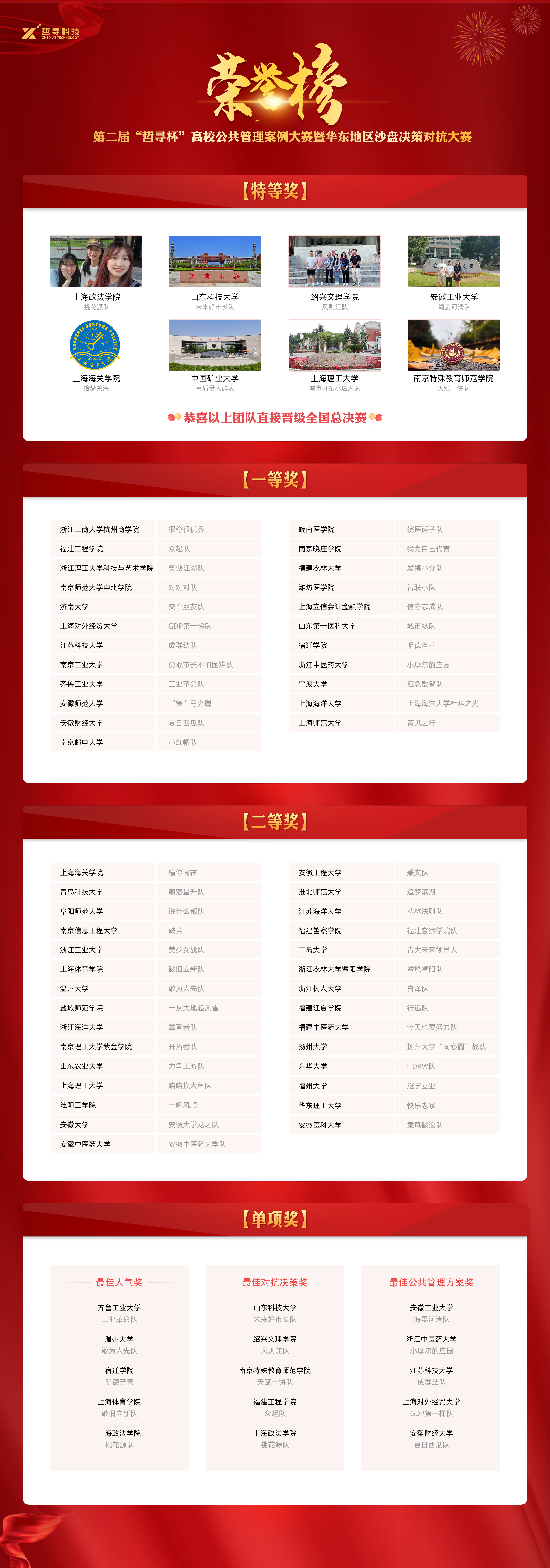 三阶段比赛结束后,由南京大学孔繁斌教授宣布了第二届“哲寻杯”高校公共管理案例大赛暨华东地区沙盘决策对抗赛获奖名单,中国矿业大学、上海理工大学等8支队伍获得了特等奖,济南大学、上海师范大学等23支队伍获得了一等奖,华东理工大学、安徽大学等29支队伍获得了二等奖,此外齐鲁工业大学等5支队伍获得最佳人气奖,山东科技大学等5支队伍获得最佳决策对抗奖,安徽工业大学等五支队伍获得最佳公共管理方案奖。“千淘万漉虽辛苦,吹尽狂沙始到金”、“一年一度秋风劲,不似春光,胜似春光,寥廓江天万里霜”,祝贺获奖的团队。大赛,我们明年再来!