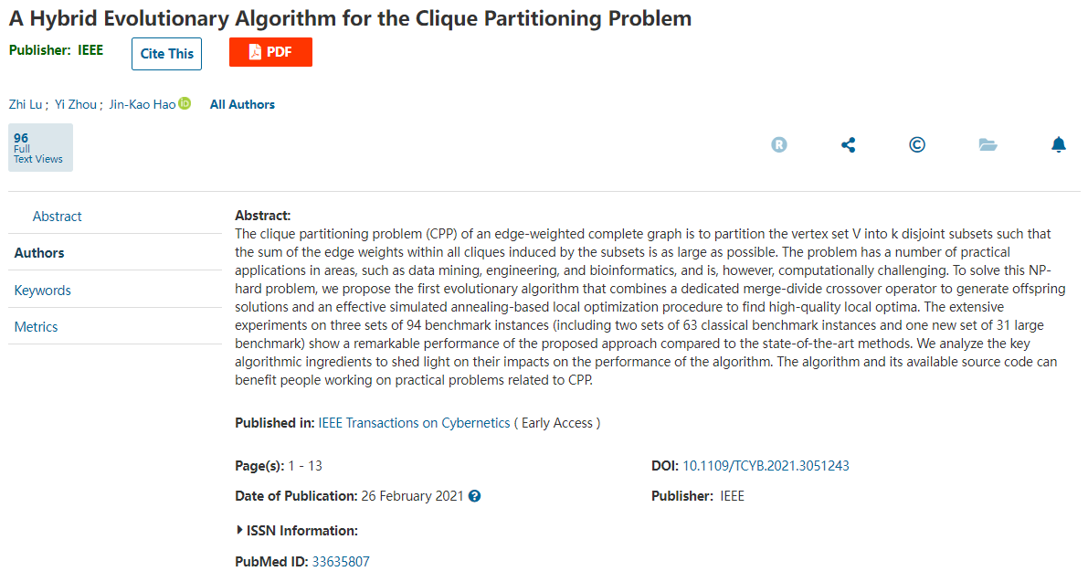 近日,我校管理学院青年教师陆芷在国际顶级期刊《IEEE Transactions on Cybernetics》上发表论文“A Hybrid Evolutionary Algorithm for the Clique Partitioning Problem (针对团分割问题的混合进化算法)”。该论文以上海理工大学管理学院为第一单位,陆芷老师为第一作者,电子科技大学周毅副教授和法国昂热大学Jin-Kao Hao教授为共同通讯作者。