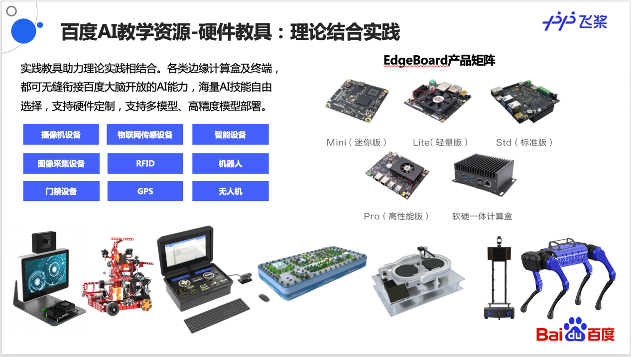 截至目前,百度飞桨已经凝聚了370万开发者,服务14万家企事业单位,覆盖了金融、交通、物流等数十个行业,基于飞桨平台创造了超过42.5万个模型。百度人工智能校企合作解决方案主要包括:提供算力资源、算法组件支持,一站式教学+实训平台环境、与Linux Foundation 开源软件学园合作推出的国内深度学习工程师联合认证、企业师资、产业级教学案例及数据集等。百度创新实践平台解决方案,主要包括:数据中心提供数据采集、标注、清洗、加工等一站式数据服务、开发中心面向用户同时提供机器学习和深度学习环境、提供一站式人工智能模型建设功能服务集以及对AI资产进行集中管理等。