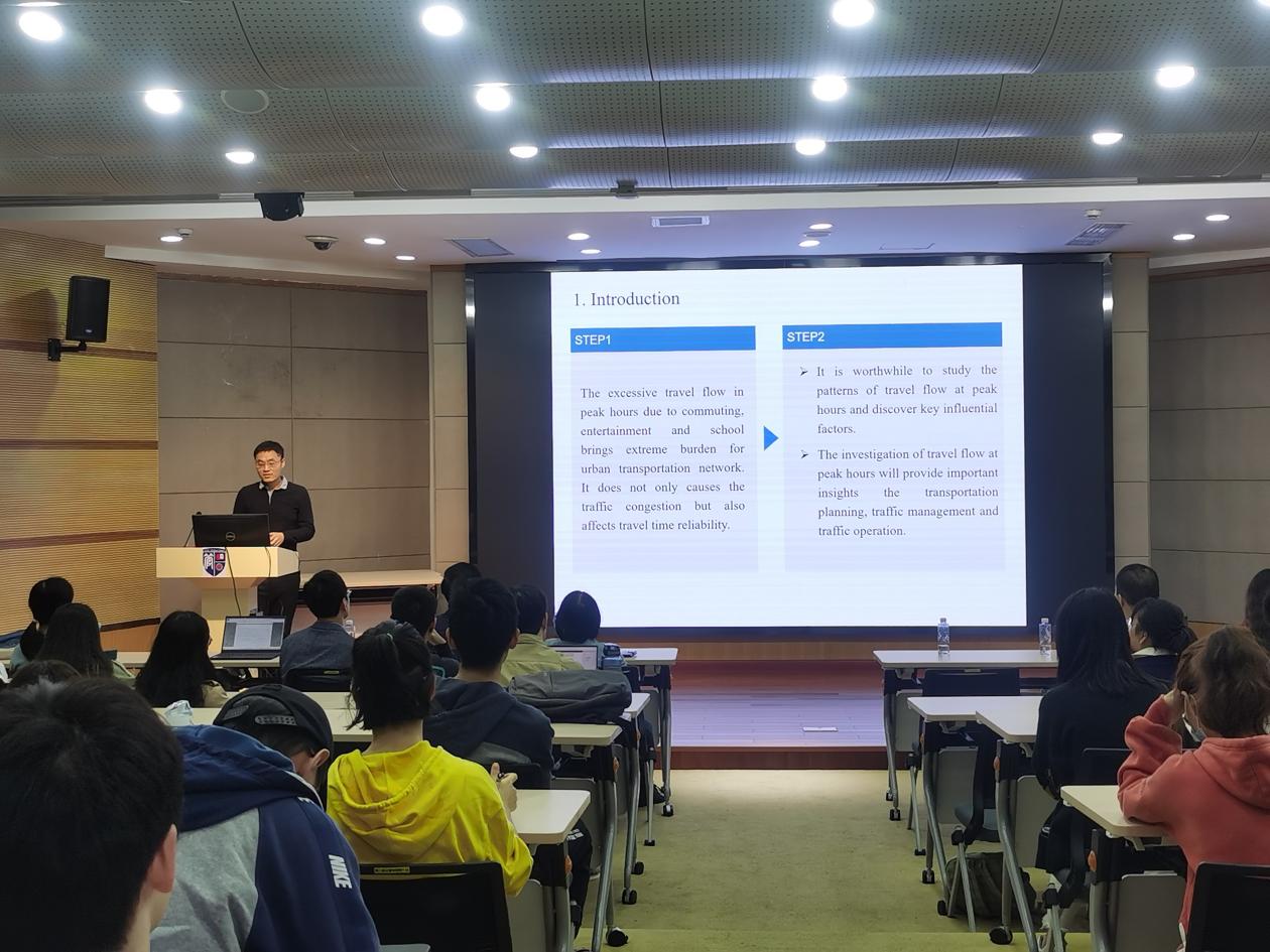 接着,周亦威博士作了题为“A spatial model with endogenous weight matrix for investigating travel flow differences between peak hours with massive mobile phone data”的学术报告。周亦威老师首先介绍了城市交通流分析的研究背景,指出当前研究存在忽略空间效应和内生性的问题。随后,周亦威老师针对上述问题,从变量选取、理论建模、结果分析等方面进行了具体阐述,证实了内生空间效应的存在,并指出办公楼数量、商场数量等变量对于早晚高峰交通流差异有着显著影响,并结合杭州十四五规划做了相关的政策分析。最后,周亦威老师对当前研究的不足做了总结,并对未来研究进行了展望。