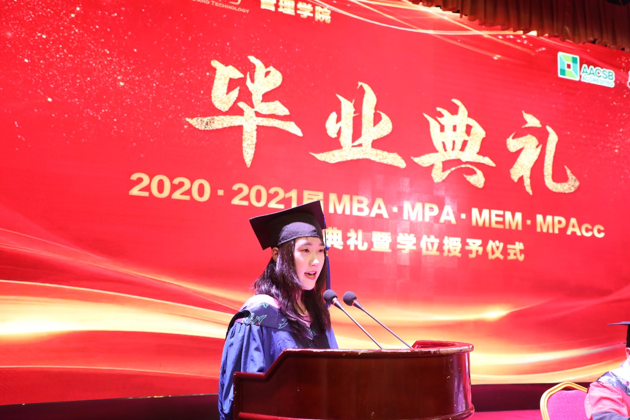 2021届MPAcc的朱寅慧,作为MBA、MPA、MEM以及首届MPAcc的毕业生代表发言。她感言道,今天我们终于顺利毕业了!在此我想先把最真诚的感谢和最热烈的掌声送给所有给予我们帮助的老师、家人、同学、朋友还有不曾放弃努力的自己!两年前,怀着一颗渴望再次回到大学的心,我选择来到上海理工大学读研,坐在台下聆听着开学典礼上的发言,内心兴奋又激动。两年时间稍纵即逝,此刻站在这里我的心里又多了一份眷恋和充实,感觉收获满满,庆幸自己当时的选择。在上海理工大学,我们遇到的老师们教会了我们技能,教会了我们方法,也教会了我们很多人生道理,在他们身上,我们看到了信义勤爱,看到了思学志远。这样的老师和学校氛围激励着我们不断守正出新,砥砺奋进。身处百年未有之大变局中,我们要时刻铭记历史的经验教训,勿忘初心,既要低头赶路,也要仰望星空。
