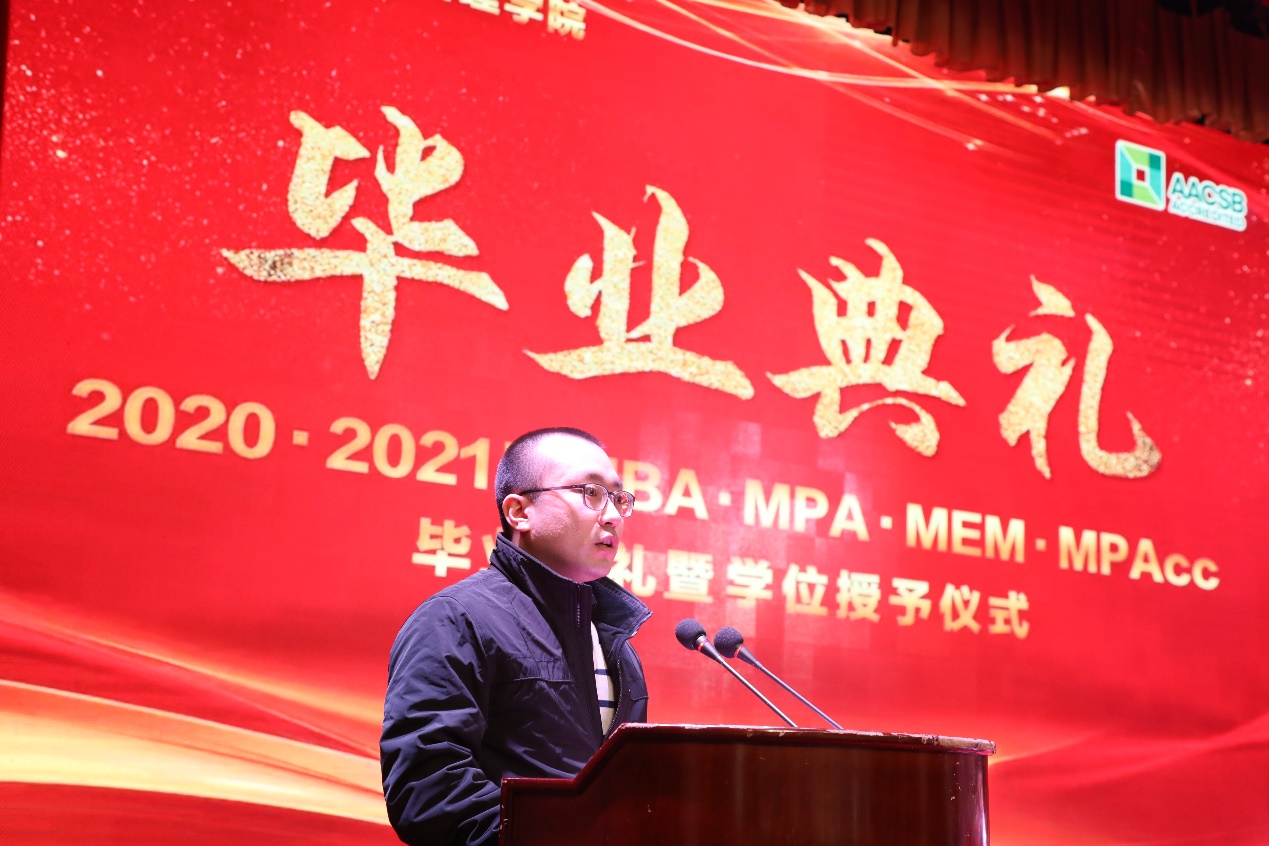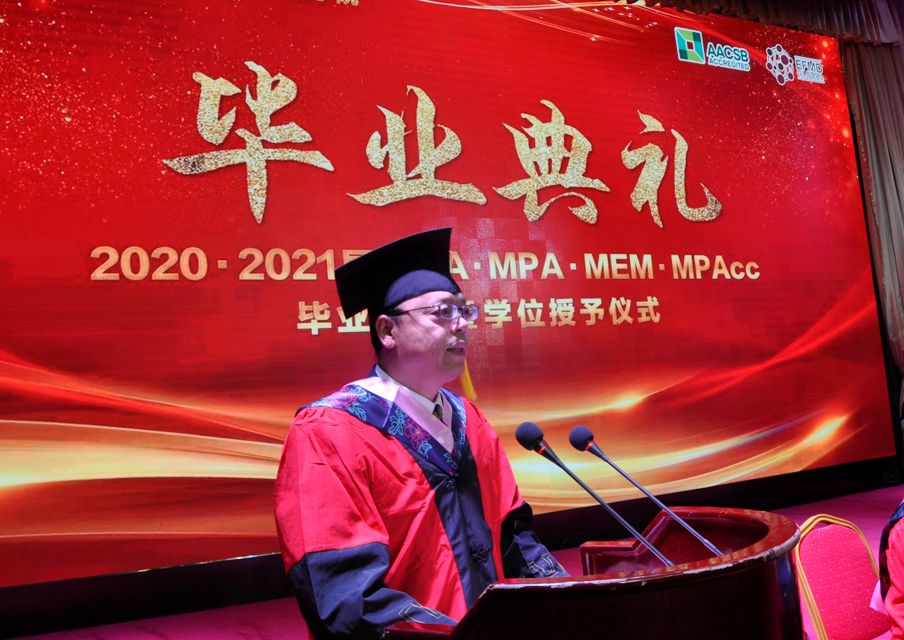 赵来军院长首先致辞,他代表管理学院对各位同学顺利毕业并取得硕士学位表示热烈祝贺!同时感谢各位领导、嘉宾、老师参加毕业典礼,共同见证2020届、2021届专业学位同学人生中重大而又庄严的时刻。