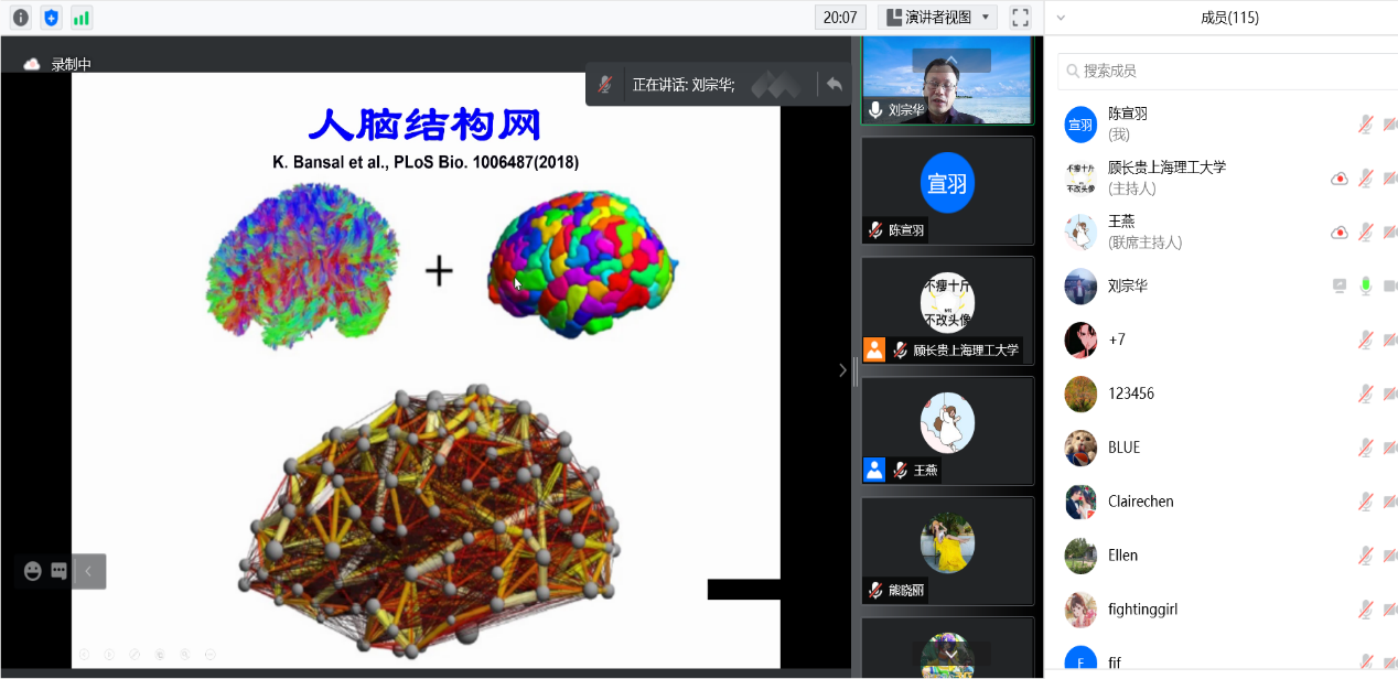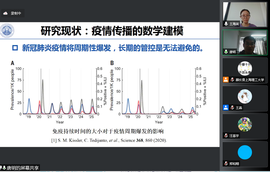 华东师范大学刘宗华教授和复旦大学李春贺副教授分别作了“Remote firing propagation in brain network”和“生物网络的随机动力学方法及应用”的报告。他们分别从理论物理中遥传播的角度和随机动力学中势能的概念出发,为大家分享了他们在生物复杂系统研究中所取得的最新成果。随后,华东师范大学唐明研究员、浙江工业大学阮中远博士、上海师范大学邱路副教授分别作了关于新冠疫情政策的量化分析、信息传播动力学、大脑网络稳定性方面的报告。他们的工作新颖前沿,引起了与会师生的充分讨论。