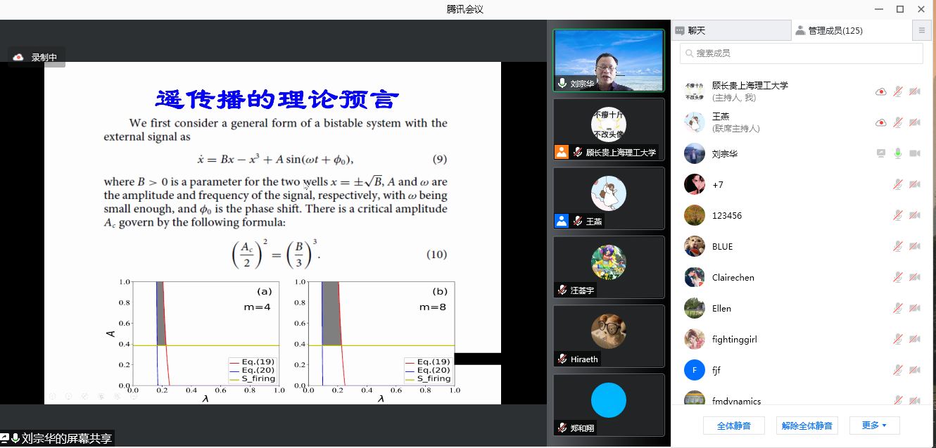 华东师范大学刘宗华教授和复旦大学李春贺副教授分别作了“Remote firing propagation in brain network”和“生物网络的随机动力学方法及应用”的报告。他们分别从理论物理中遥传播的角度和随机动力学中势能的概念出发,为大家分享了他们在生物复杂系统研究中所取得的最新成果。随后,华东师范大学唐明研究员、浙江工业大学阮中远博士、上海师范大学邱路副教授分别作了关于新冠疫情政策的量化分析、信息传播动力学、大脑网络稳定性方面的报告。他们的工作新颖前沿,引起了与会师生的充分讨论。
