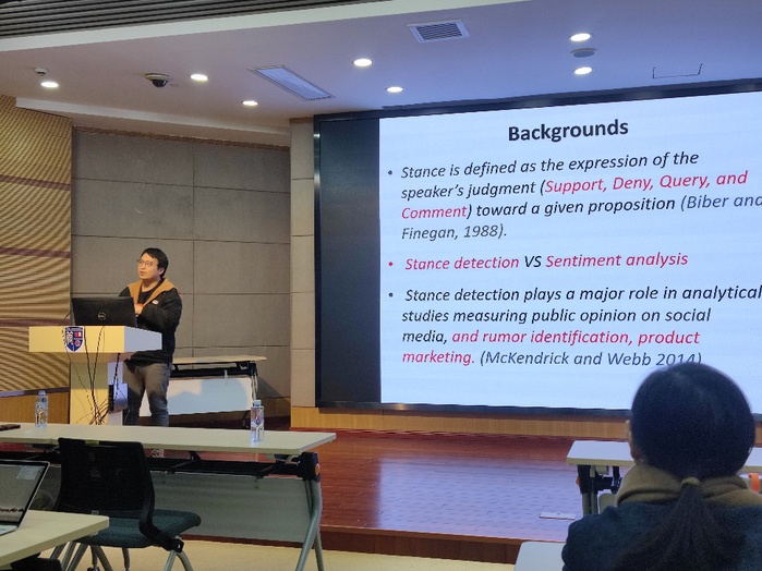 首先,周立欣博士为师生作了题为“Infusing external knowledge into stance detection task on socialplatforms”的学术报告,其针对在线社交平台的用户评论进行立场检测,旨在对某一特定话题之下用户的评论信息进行立场的分类。周博士指出现有立场检测研究大都只关注评论文本的内部语义特征,忽略了与评论文本相关的外部知识。该研究通过将评论的关键信息映射到知识图谱中来检索与该关键信息有关的外部知识,基于图神经网络将外部知识引入到立场检测任务中,提升社交网络立场检测任务的效果,为舆情控制、谣言识别等现实应用提供决策支持。