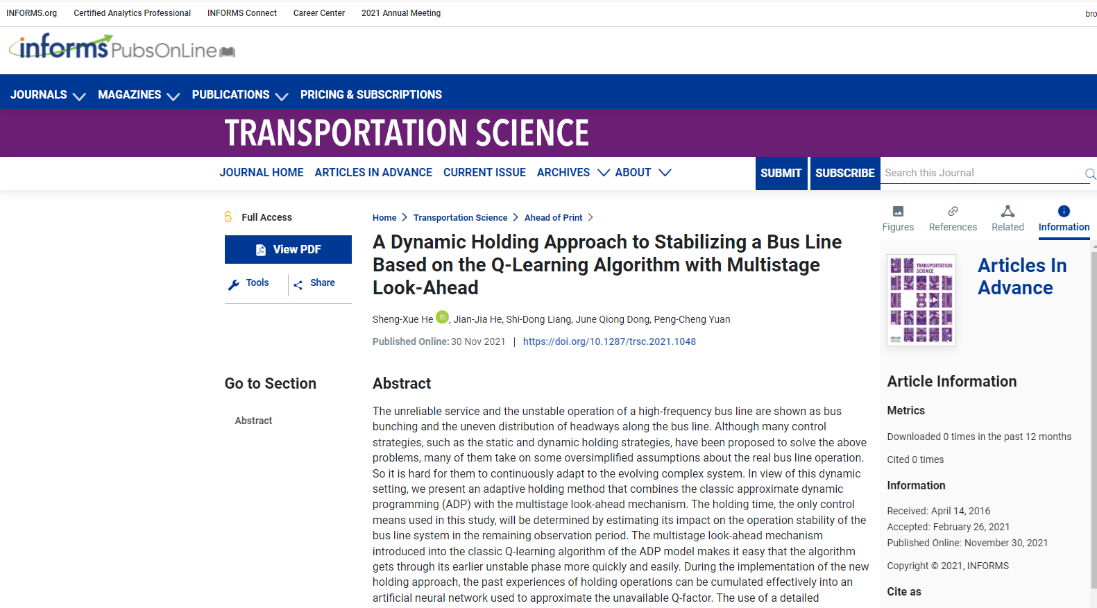 近日,我院何胜学、何建佳、梁士栋、董琼、袁鹏程老师合作的论文“A Dynamic Holding Approach to Stabilizing a Bus Line Based on the Q-Learning Algorithm with Multistage Look-Ahead”(《基于多级前瞻Q学习算法的公交线路动态驻站控制方法》)在运筹与管理及交通类的国际顶级期刊Transportation Science(《交通运输科学》)在线发表。Transportation Science是INFORMS 11种期刊之一,本刊为季刊,年发文量在80篇左右,发表周期一般超过三年,本论文从投稿到在线发表耗时5年半。该刊是国际上公认的运筹与管理和交通类顶级期刊,2020年的影响因子为4.117,属于管理学院TOP期刊中的A类期刊,这也是我校教师首次在INFORMS 11种期刊上发文,标志着我校在相关研究领域取得重大突破。