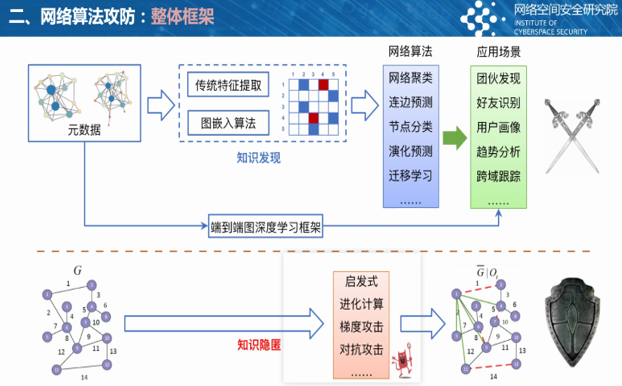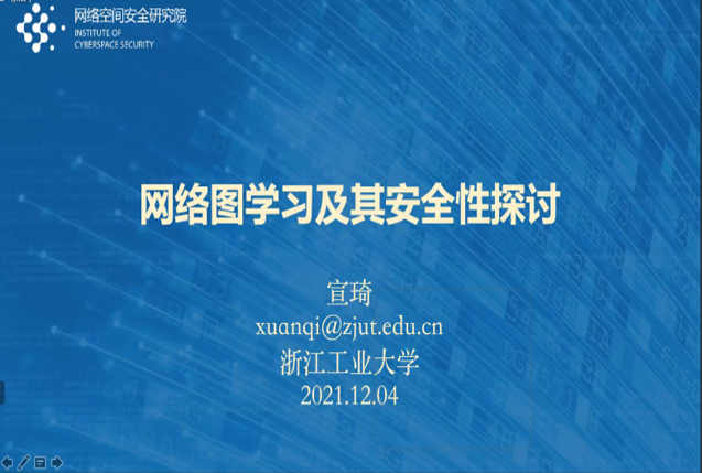 接下来宣琦教授带来了“网络图学习及其安全性探讨”的报告,宣琦是浙江工业大学网络空间安全研究院授院教授、院长。入选浙江高校中青年学科带头人、浙江省杰出青年基金获得者。主要从事图数据挖掘、人工智能应用及安全等领域的研究工作,在ICSE、FSE、TKDE、PRE等国际知名期刊及会议上发表学术论文100余篇,授权受理发明专利100余项,获得浙江省科技进步奖1项。主持多项国家自然科学基金,浙江省重点研发计划等相关课题,并与中电科、国家互联网应急中心、华为等开展多项合作项目。宣琦教授在报告中探讨了基于网络图学习的用户行为分析、网络学习算法的攻防研究、针对网络图学习算法的增强研究。