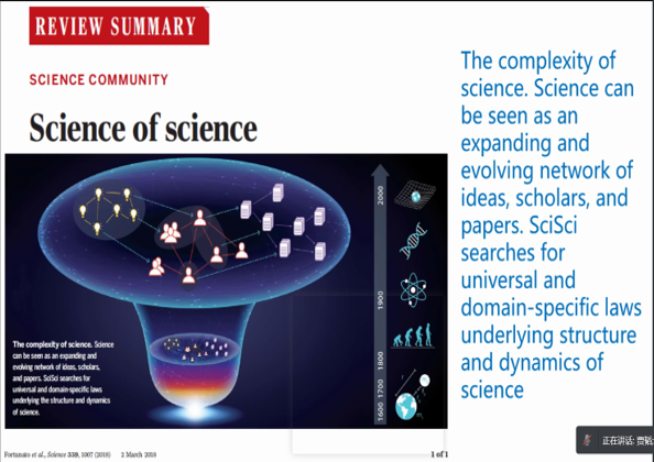 贾韬教授带来了关于科学学的讲座—“科学的科学: 大数据下的科学中的规律”。贾韬是西南大学信息化建设办公室任主任,计算机与信息科学学院授教授。2004 年获得南京大学物理专业学士学位,2004 年至 2011 年于美国弗吉尼亚理工大学(Virginia Tech)分别获得工业与系统工程专业硕士学位、物理专业硕士和博士学位。2011 年至 2015 年分别在美国东北大学(Northeastern University)和美国伦斯勒理工大学(Rensselaer Polytechnic Institute)从事博士后研究。贾韬研究方向集中于数据科学和复杂网络,以第一作者(兼共同通讯作者)在《Nature Human Behaviour》、《Nature Communications》、《Physical Review Letters》等学术期刊发表工作。2011 年获得了国家留学基金委颁发的2010 年度国家优秀自费留学生奖学金。2015 年获国家人才计划青年项目。贾韬教授课题组利用Web of Science上超过5000万篇论文以及他们之间超过7亿条引用关系,分析了国家层面的科学学、量化了国家科研成果的相互引用关系,揭示了国际科学版图宏的“东方-西方”分级现象,指出,中国在科学社区演化中扮演重要的作用,在某些科学领域论文数量和引用保持高增长。