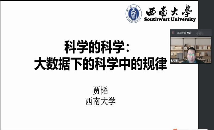 贾韬教授带来了关于科学学的讲座—“科学的科学: 大数据下的科学中的规律”。贾韬是西南大学信息化建设办公室任主任,计算机与信息科学学院授教授。2004 年获得南京大学物理专业学士学位,2004 年至 2011 年于美国弗吉尼亚理工大学(Virginia Tech)分别获得工业与系统工程专业硕士学位、物理专业硕士和博士学位。2011 年至 2015 年分别在美国东北大学(Northeastern University)和美国伦斯勒理工大学(Rensselaer Polytechnic Institute)从事博士后研究。贾韬研究方向集中于数据科学和复杂网络,以第一作者(兼共同通讯作者)在《Nature Human Behaviour》、《Nature Communications》、《Physical Review Letters》等学术期刊发表工作。2011 年获得了国家留学基金委颁发的2010 年度国家优秀自费留学生奖学金。2015 年获国家人才计划青年项目。贾韬教授课题组利用Web of Science上超过5000万篇论文以及他们之间超过7亿条引用关系,分析了国家层面的科学学、量化了国家科研成果的相互引用关系,揭示了国际科学版图宏的“东方-西方”分级现象,指出,中国在科学社区演化中扮演重要的作用,在某些科学领域论文数量和引用保持高增长。