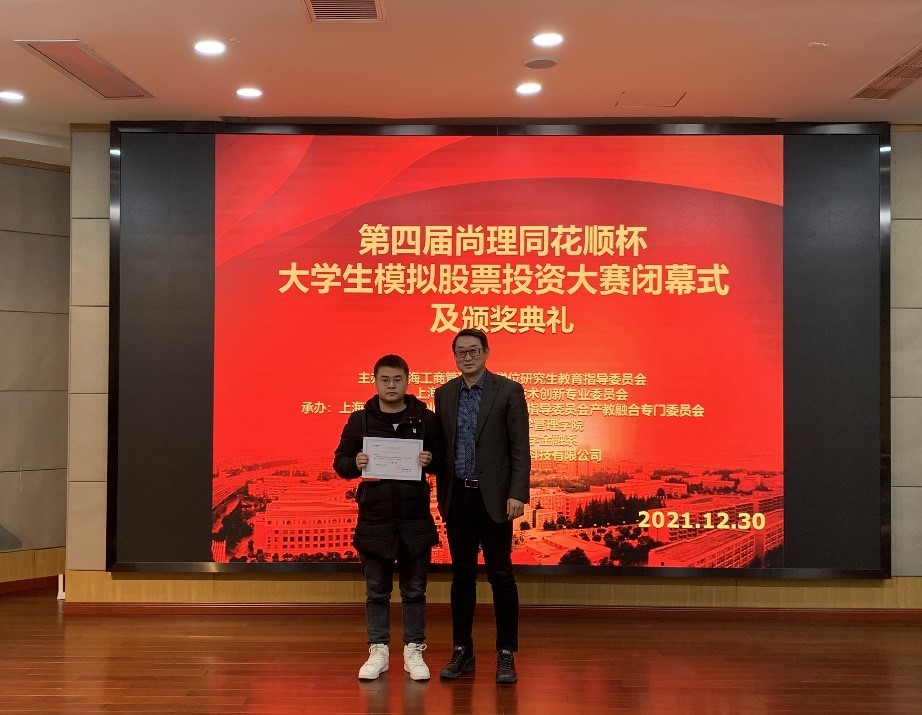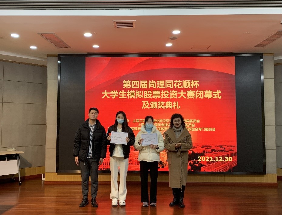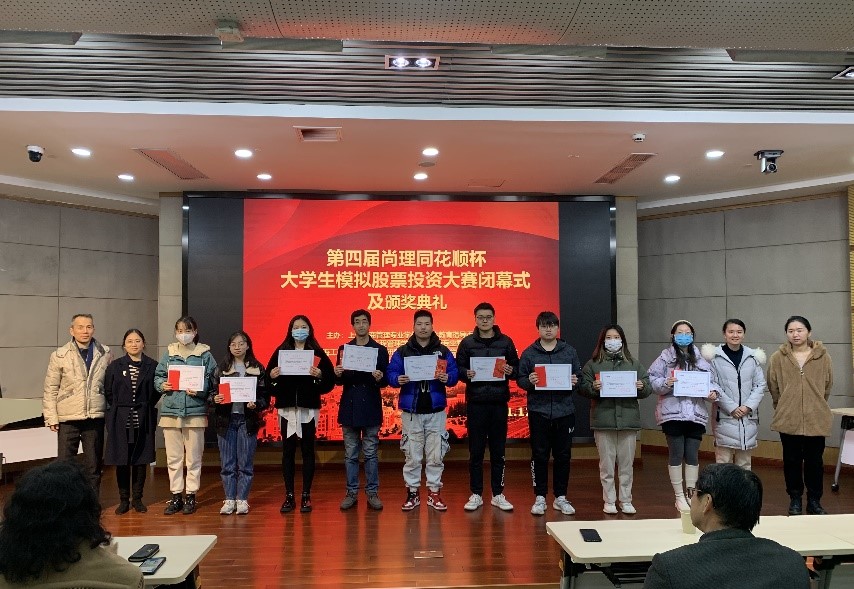 为加强知识学习与实践实操的关联,丰富学生课外实践活动、培养大学生的金融实践能力,在成功举办三届模拟股票投资大赛的基础上,由上海工商管理专业学位研究生教育指导委员会、上海工程管理学会技术创新专业委员会主办,上海工商管理专业学位研究生教育指导委员会产教融合专门委员会、上海理工大学管理学院、上海理工大学金融系承办,浙江同花顺网络信息股份有限公司协办的第四届尚理同花顺杯大学生模拟股票投资大赛圆满完成比赛日程,于2021年12月30日在管理学院第二会议室(报告厅)举行了隆重的颁奖典礼。管理学院副院长张峥、金融专硕项目主任孙英隽、同花顺网络信息股份有限公司高校高级经理黄煜罡以及金融系老师出席了颁奖典礼。