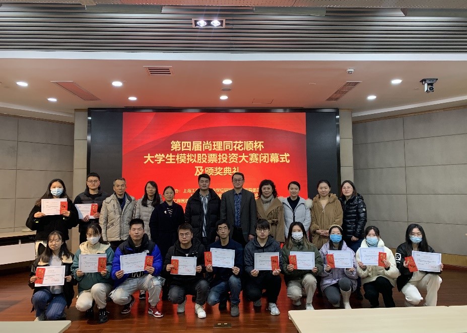 为加强知识学习与实践实操的关联,丰富学生课外实践活动、培养大学生的金融实践能力,在成功举办三届模拟股票投资大赛的基础上,由上海工商管理专业学位研究生教育指导委员会、上海工程管理学会技术创新专业委员会主办,上海工商管理专业学位研究生教育指导委员会产教融合专门委员会、上海理工大学管理学院、上海理工大学金融系承办,浙江同花顺网络信息股份有限公司协办的第四届尚理同花顺杯大学生模拟股票投资大赛圆满完成比赛日程,于2021年12月30日在管理学院第二会议室(报告厅)举行了隆重的颁奖典礼。管理学院副院长张峥、金融专硕项目主任孙英隽、同花顺网络信息股份有限公司高校高级经理黄煜罡以及金融系老师出席了颁奖典礼。