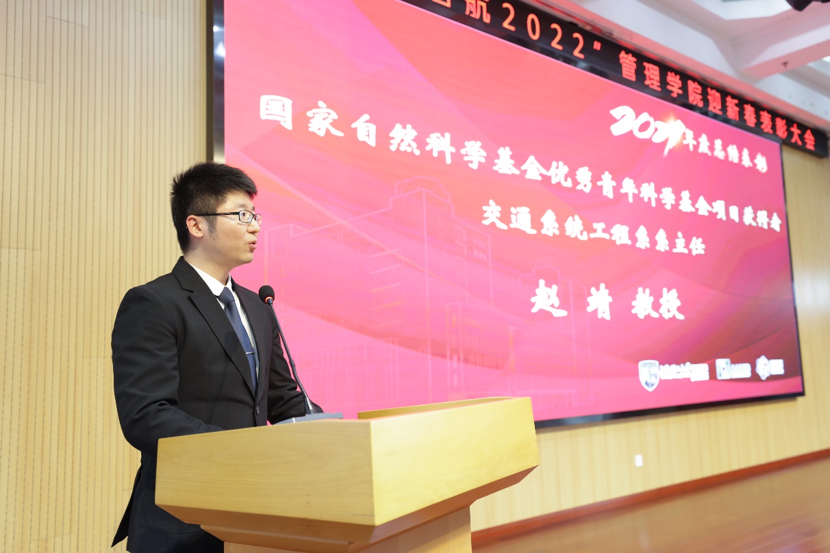 国家自然科学基金优秀青年科学基金项目获得者、交通系统工程系主任赵靖教授作为获奖教师代表以“感谢”、“感怀”、“感悟”三个关键词发表获奖感言,他期望2022年学院全体老师秉承管理学院凝心聚力、砥砺前行的优良传统和与时偕行、小步快跑的发展思路,为学校建设特色显著的一流理工科大学而奋斗。