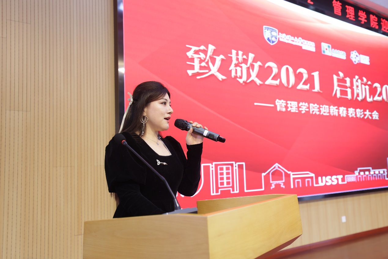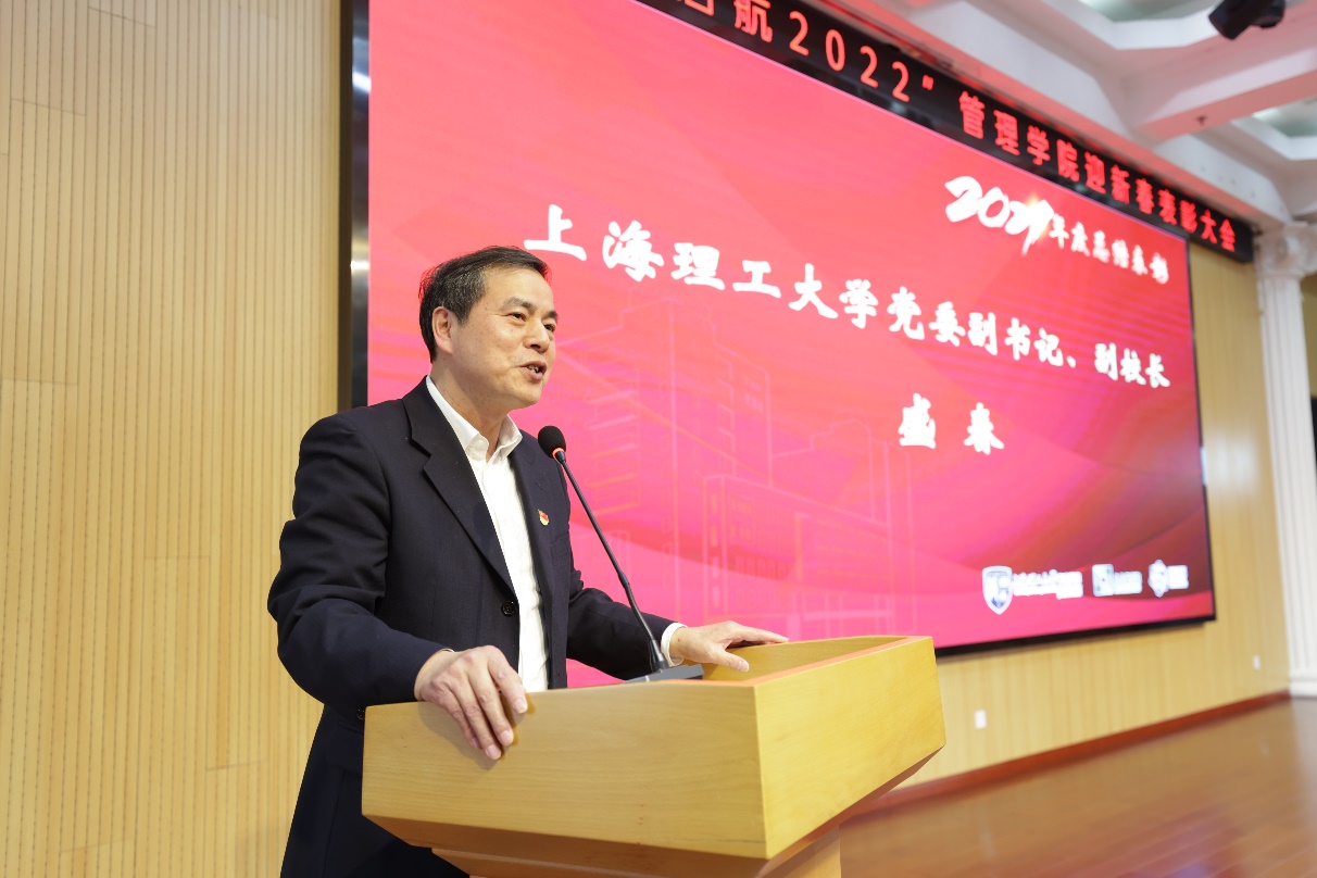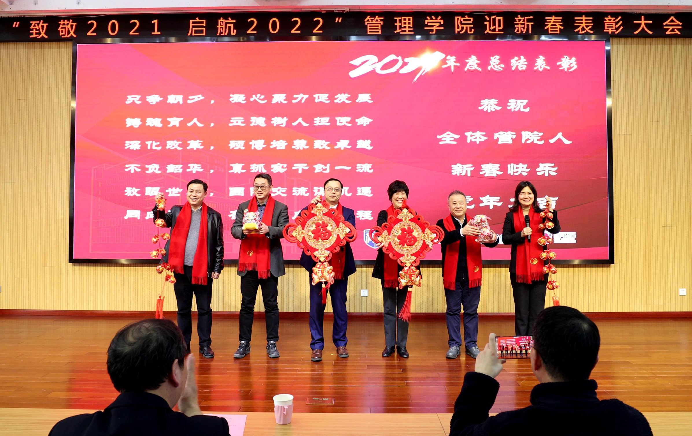 校党委副书记、副校长盛春代表学校党委向获奖者表示祝贺,向为管理学院做出贡献的各位老师表示感谢。他指出,2021年管理学院办学绩效考核取得了排名全校第三的好成绩,“十四五”实现了开门红!今天的大会既是对取得丰硕成果教职工的肯定和鼓励,也是对2021年的总结,更是对2022年的殷切期盼。新的一年希望管理学院的各位老师不忘初心,牢记使命,踔厉奋发,笃行不怠,以时不我待只争朝夕的精神投入工作中,为学院建设添砖加瓦,为学校事业腾飞建功立业。同时,他衷心祝福各位老师们新春快乐,身体健康,阖家幸福!