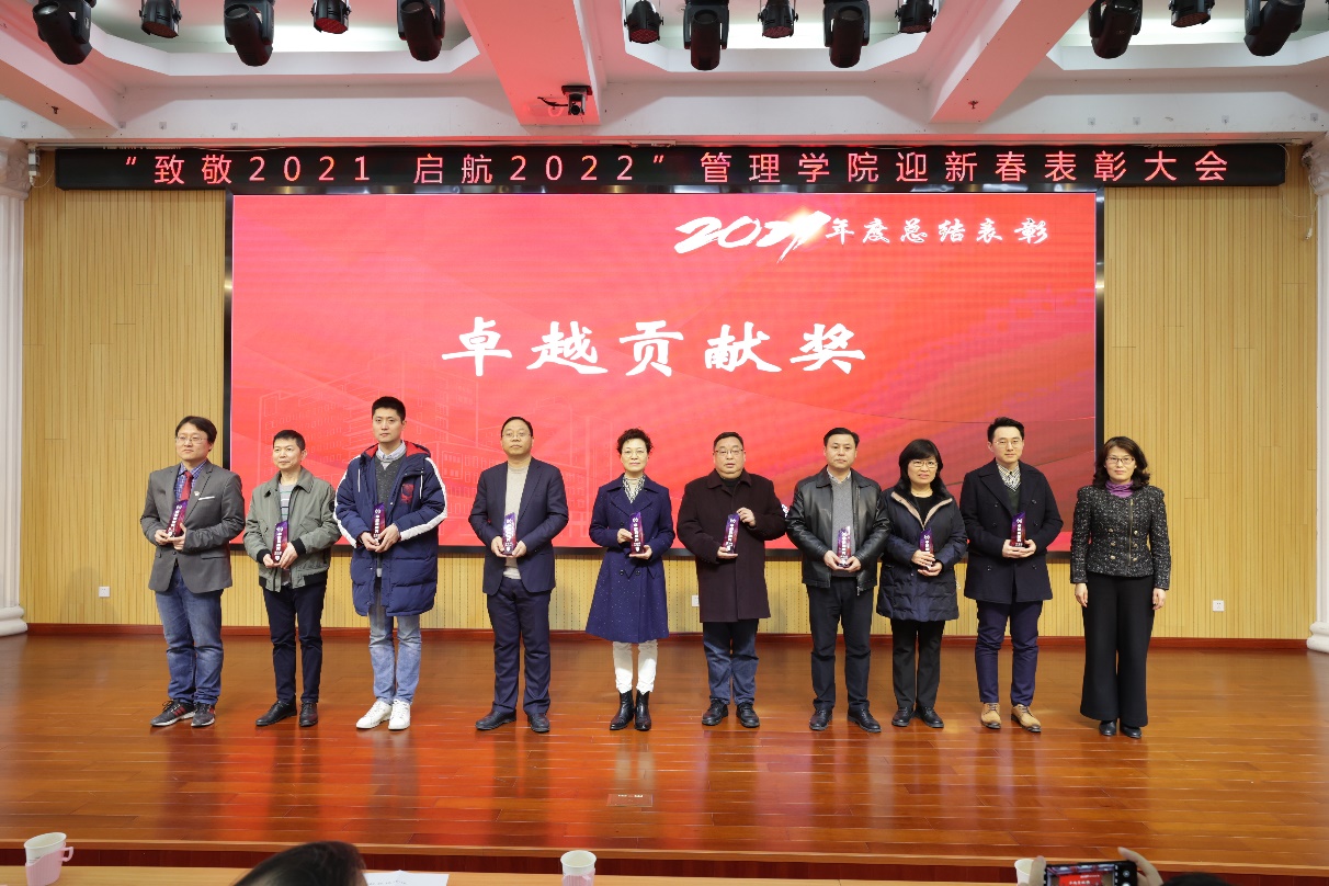 教师授予“突出贡献奖”,向党政综合办公室等10个部门授予“集体贡献奖”,向车丽萍等35位老师授予“卓越贡献奖”,向赵来军、赵靖、杨维新、何胜学、陶杰、卞泽阳6位老师授予“重大贡献奖”。
