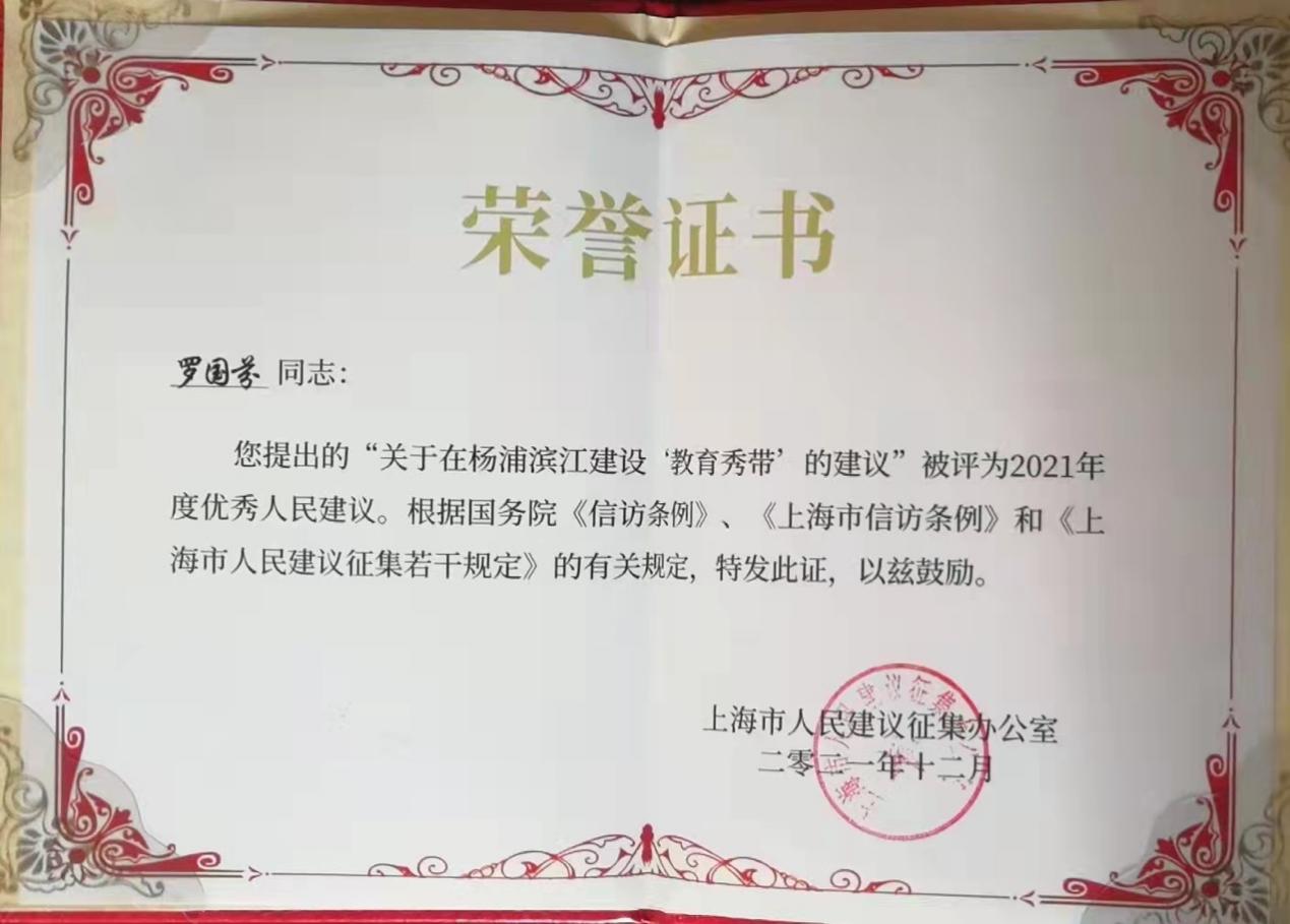 上海市人民建议征集办公室根据国务院《信访条例》、《上海市信访条例》和《上海市人民建议征集若干规定》的有关规定,向罗国芬同志颁发“2021年度上海市优秀人民建议”荣誉证书和奖杯。罗国芬老师也应邀作为颁奖嘉宾向获奖单位颁奖。