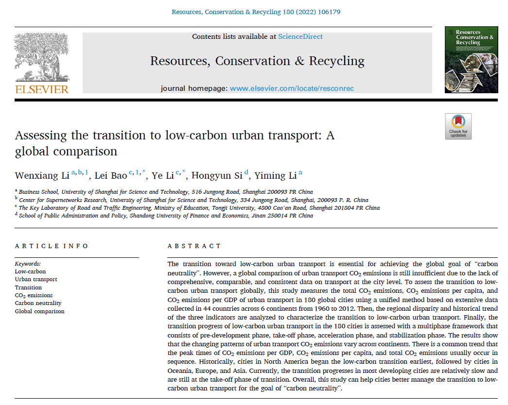 近日,我院青年教师李文翔在国际顶级期刊 Resources, Conservation & Recycling(中科院一区,Top期刊,IF=10.204)上发表论文 Assessing the transition to low-carbon urban transport: A global comparison(城市交通低碳转型发展评估:全球对比研究)。该论文以上海理工大学管理学院为第一单位,李文翔老师为第一作者,同济大学包磊博士、李晔教授为共同通讯作者。