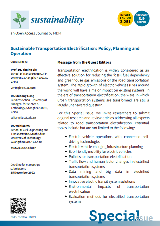 投稿链接:https://www-mdpi-coms.webvpn.usst.edu.cn/journal/sustainability/special_issues/Sustainable_Transportation_Electrification