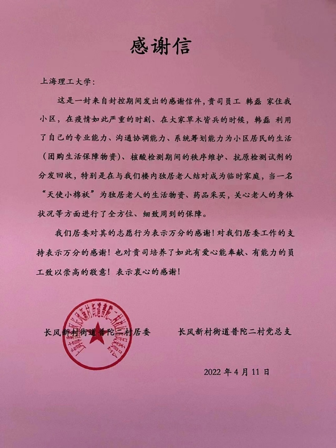 居家隔离后,疫情防控形势日趋严峻,同时封控时间久了之后,小区出现老人配药、小区物资发放、分楼层分楼宇核酸检测人手不足等一系列问题。“发现这些问题后,我们自发组织了一个社区志愿者队伍,连夜开会组织安排特殊问题解决方案,我借鉴学校的疫情防控管理相关措施,跟社区领导沟通,与志愿者们一起为核酸检测期间的秩序维护、抗原检测试剂回收、小区老年人配药需求提出一些解决方案,保证居民下楼不会聚集,不出现交叉感染”。除此之外,韩磊还与我们楼内独居老人结对成为临时家庭,做一名“天使小棉袄”为独居老人的生活物资、药品采买,关心老人的身体状况等方面提供了全方位、细致周到的保障。