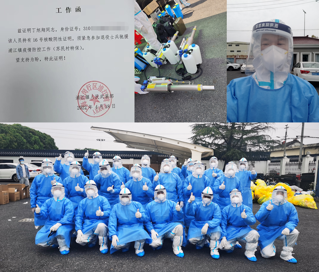 日趋紧张的疫情形势也让2019级金融专硕学生丁旭翔内心十分不安。“在听闻导师许学军教授早在3月中就奔赴抗疫一线后,我倍受触动,作为一名曾经的武警战士,我更深知国家有难,责无旁贷的道理,作为管院的一名研究生,应该马上行动起来”。丁旭翔说道,“因此,在看到上海市退役军人事务局发布的《关于招募上海退役军抗疫医疗志愿者的公告》后,我毫不犹豫的就报了名,并于4月18日到位参与消杀、药物配送、物资供应等志愿服务”。在奔赴“战场”后,他看到许多和他一样的抗疫战士,他们岗位不同行业不同,但此刻都信念如磐、目标坚定,那就是服务好群众,打赢疫情防控阻击战。