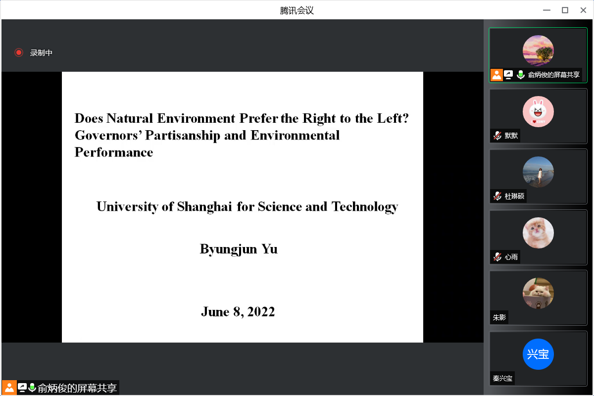 6月8日,管理学院沪江经管论坛系列活动(第二十八期)之青年学术沙龙在腾讯会议(会议号: 968-271-900) 举行,工商管理系讲师俞炳俊(YU BYUNGJUN)博士做了题为 “Governors' partisanship and environmental performance” 的学术报告。