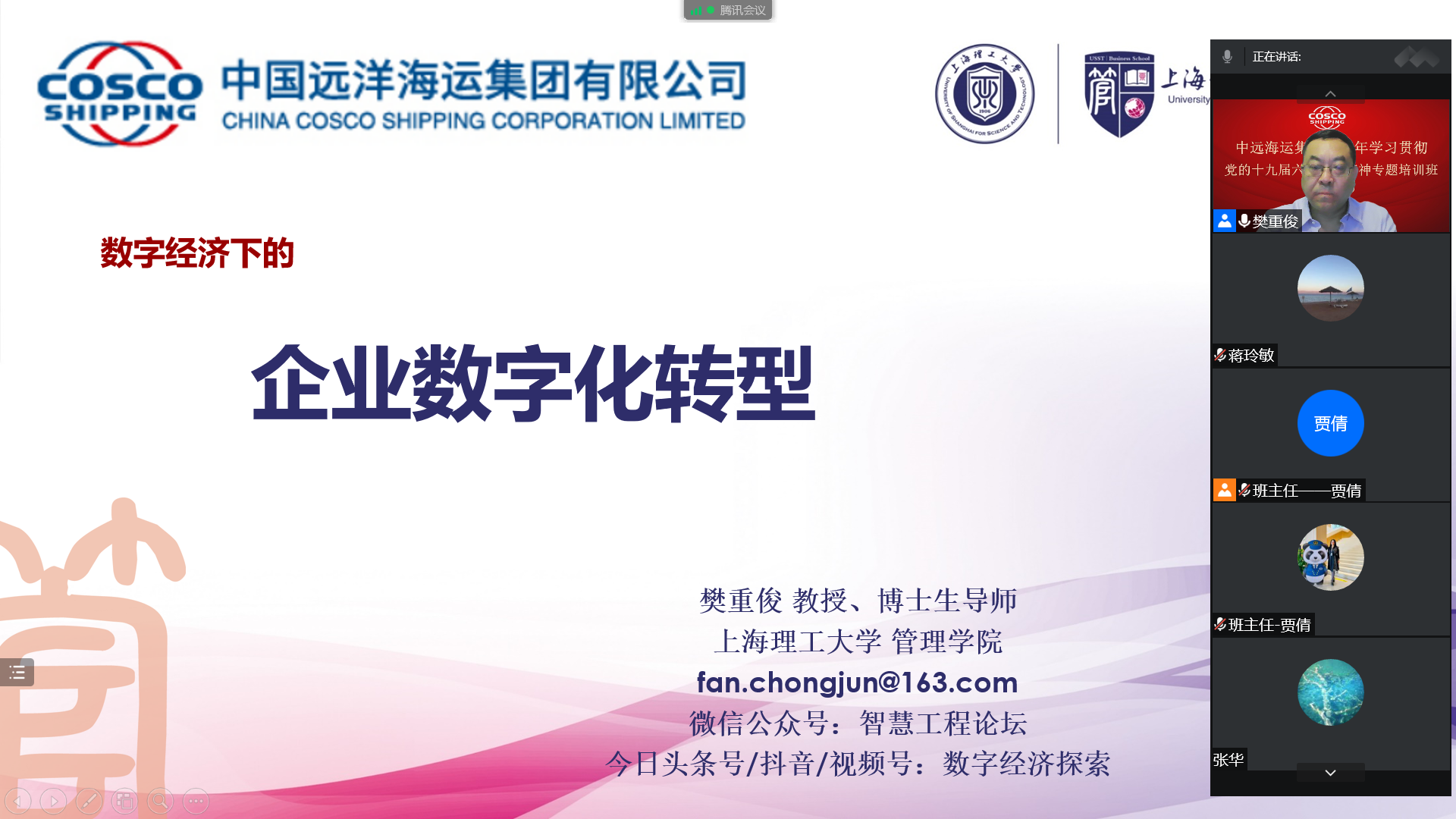 樊重俊教授于6月23日下午14:00-17:00做了《数字经济下的企业数字化转型》主题培训。首先介绍了习近平总书记《不断做强做优做大我国数字经济》的讲话精神,《“十四五”信息化和工业化深度融合发展规划》、《“十四五”数字经济发展规划》的内容,以及国际、国内数字经济与产业数字化发展现状;然后对中远海运近年来在数字化转型方面取得的成绩进行了分析与肯定,阐述了集团型管理的不同模式与对应的数字化蓝图、中远海运数字化转型战略规划的思路;最后结合中远海运的业务特点与数字化现状给出了六个方面的发展建议。