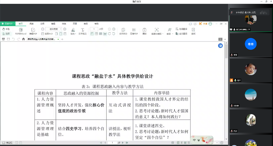 最后,葛老师给全系老师分享了《人力资源管理》课程的各种资源如教学大纲、教学设计、课程活动等,在与老师们的互动中,强调从文字把控能力和系统性两个方面进行课程思政教学案例的开发。