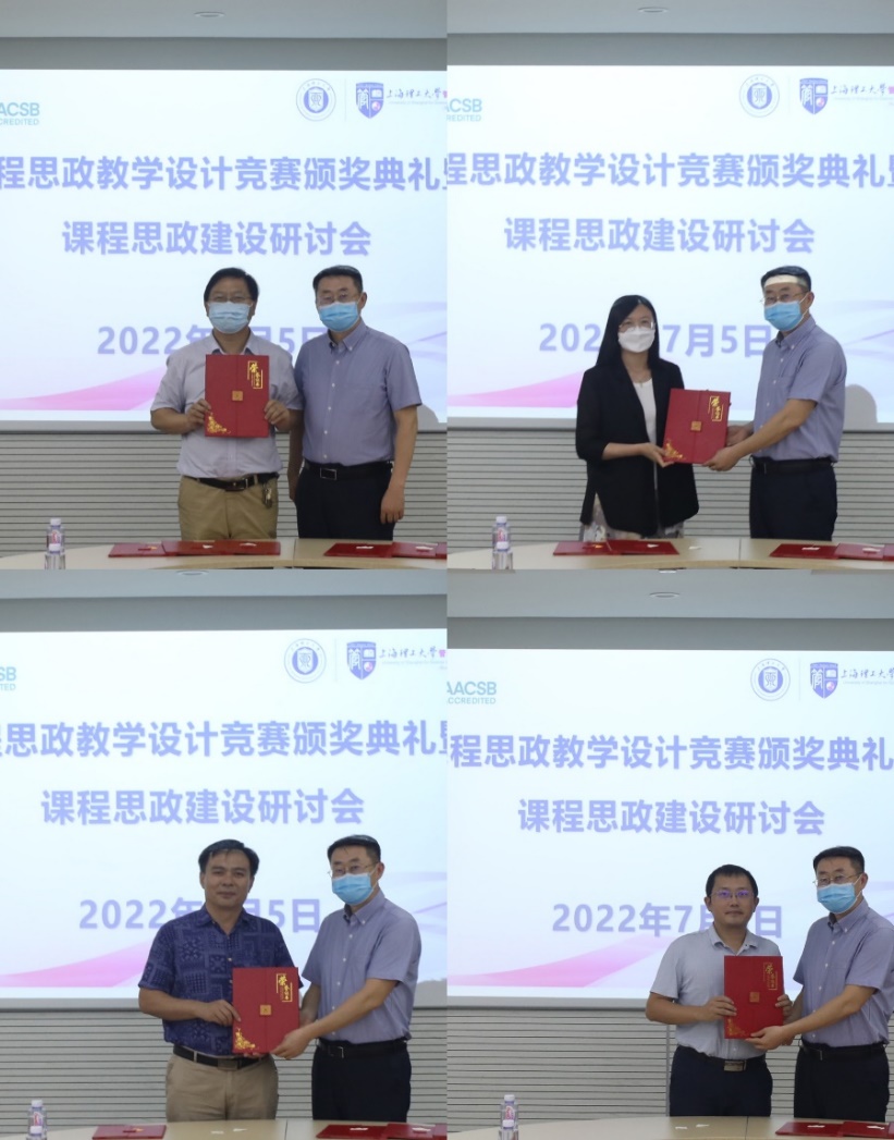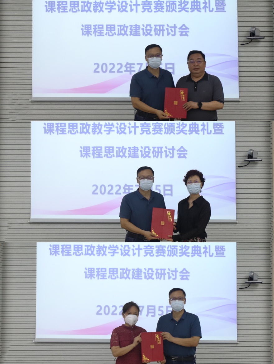 赵来军、张峥分别为获得课程思政教学设计一等奖获得者葛玉辉、车丽萍、党亚峥,二等奖获得者李军祥、刘媛华、秦炳涛、朱小栋颁奖。