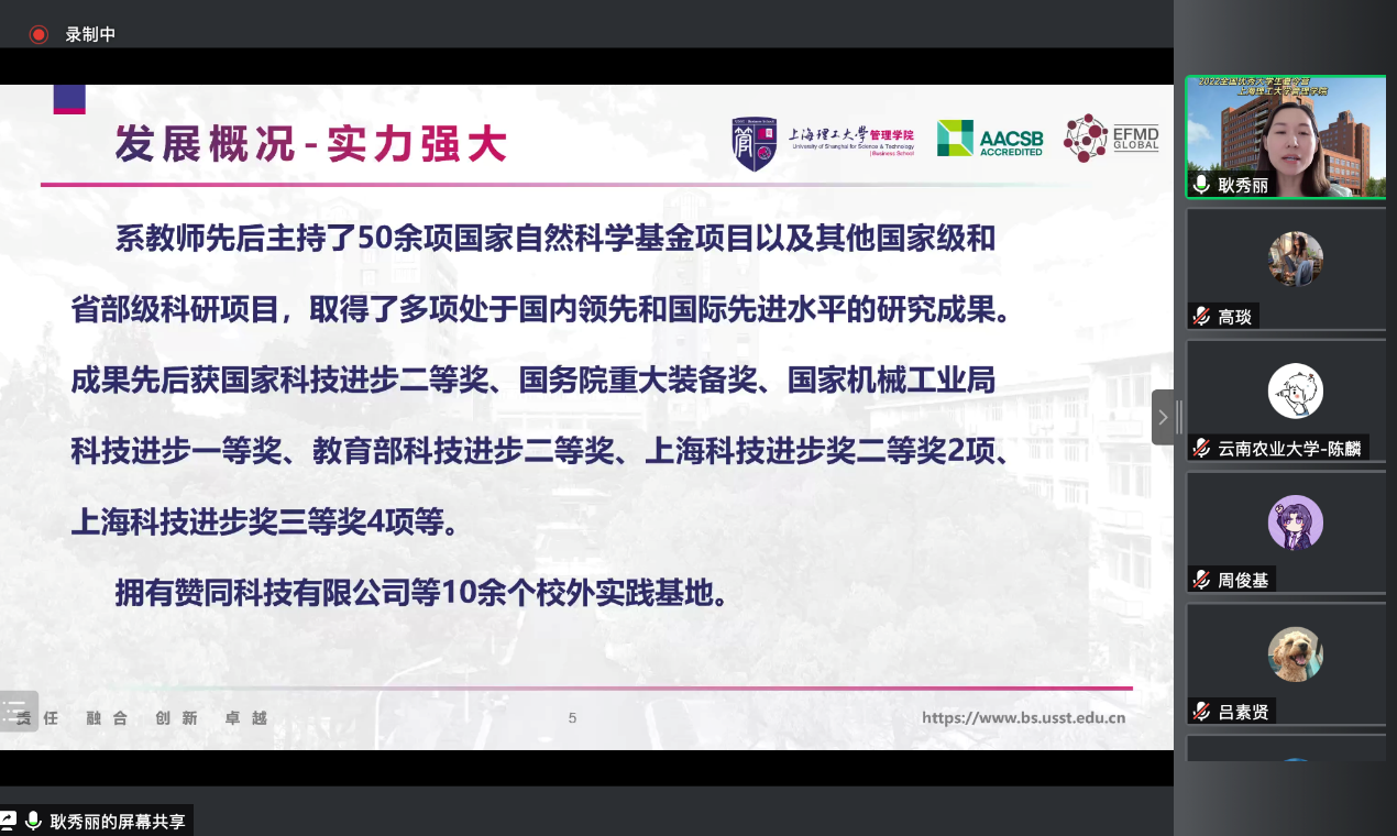 马良教授分别对上海理工大学管理科学与工程、系统工程两个学科的历史发展、学院机构的演变、师资力量、研究方向、研究生培养方案等多个方面进行了详细而全面的介绍。学员们在云端互动热烈,纷纷表示了对百年老校及其学科的向往之情。