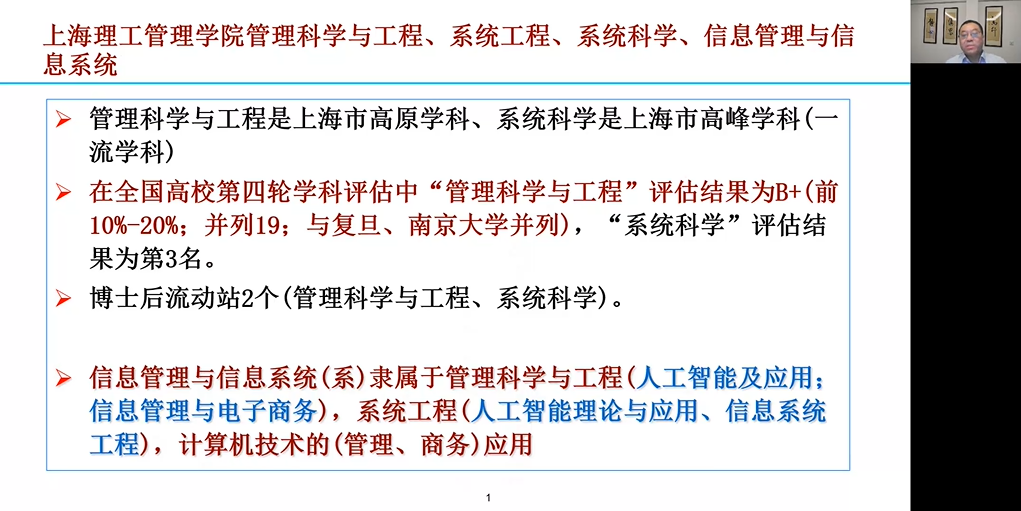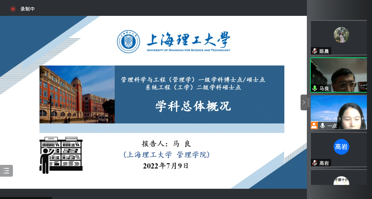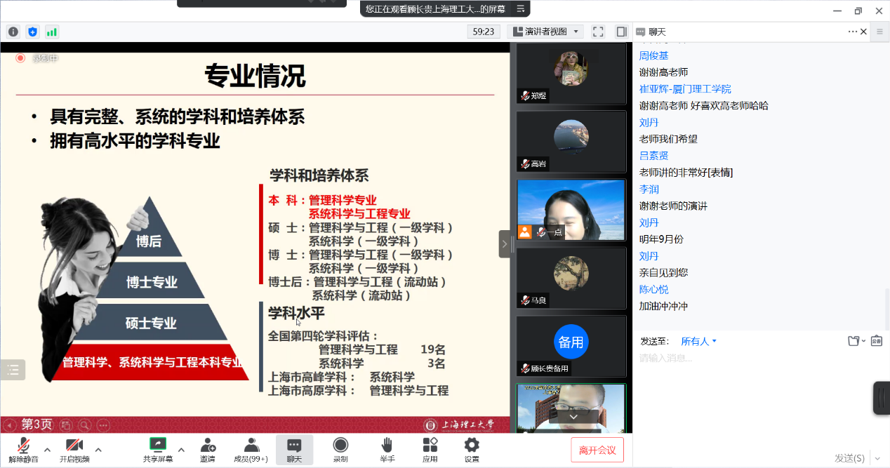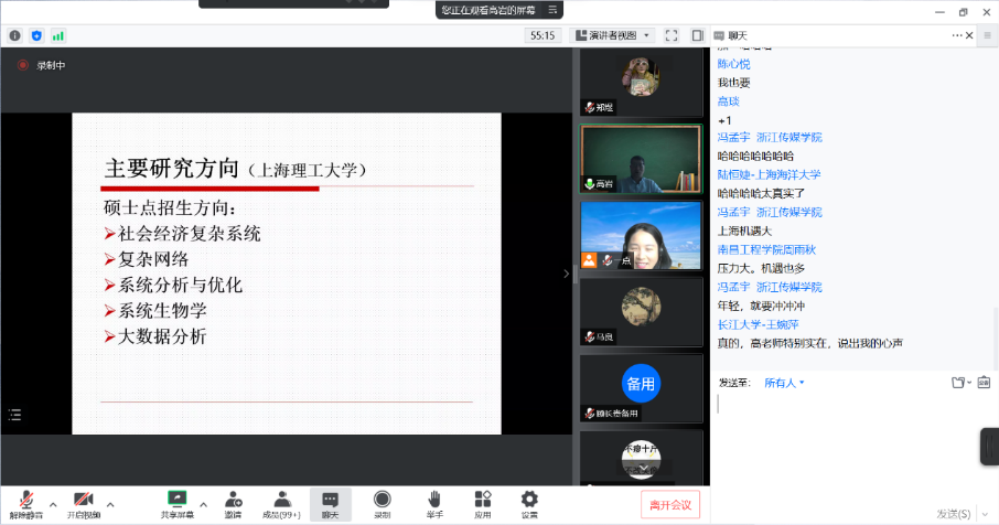 马良教授分别对上海理工大学管理科学与工程、系统工程两个学科的历史发展、学院机构的演变、师资力量、研究方向、研究生培养方案等多个方面进行了详细而全面的介绍。学员们在云端互动热烈,纷纷表示了对百年老校及其学科的向往之情。