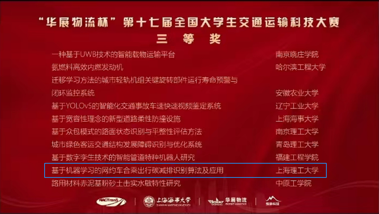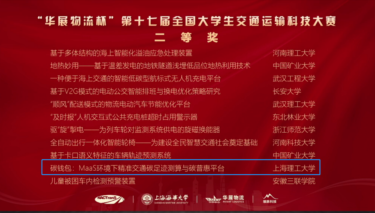 我校于今年3月18日-4月22日举办了第十七届全国大学生交通运输科技大赛上海理工大学校内选拔赛,相关专业同学踊跃报名参加,经过初评,共有12组来自不同赛道的作品被推荐参加全国赛,其中管理学院交通系统工程系的本科生项目——“碳钱包:MaaS环境下精准交通碳足迹测算与碳普惠平台”(团队成员:张逸文,杨子杰,李笑梅,李慈航,唐诗航)和研究生项目——“基于机器学习的网约车合乘出行碳减排识别算法及应用”(团队成员:李媛媛,于天翔,程佳楠,陈思薇,欧阳慧洁)经过层层选拔,成功入围决赛,并在最后决赛答辩中表现优异,分别获得全国二等奖和三等奖的佳绩。